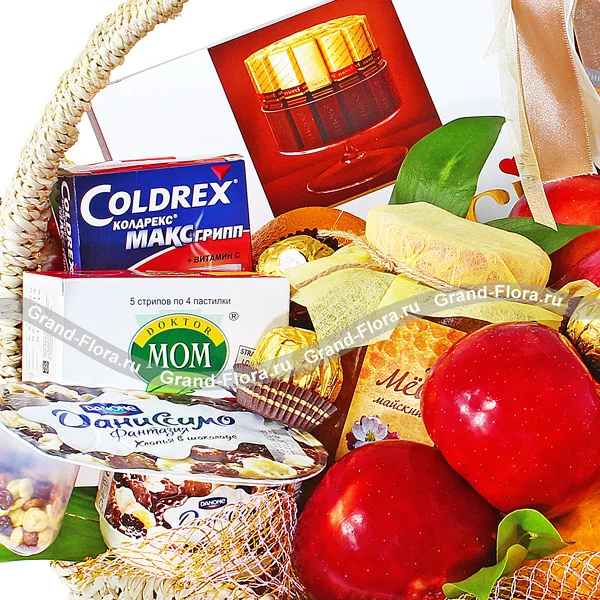 Уменьшеный: коробка конфет "Merci" - 1 шт, чай "Lipton"(черный) - 1 шт,конфеты "Ferrero Rocher" - 1 шт, Coldrex МАКС Грипп - 1уп., лимон - 1 шт,  яблоки - 0,5 кг, корзина малая, декор.